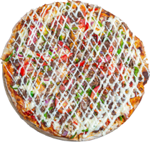 PHILLY CHEESESTREAK PIZZABeef Steak, Cheddar Cheese, Red peppers, Green Peppers, Onions, Mushrooms,Mayonnaise,Philly Sauce,Tomato Sauce & Cheese |