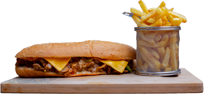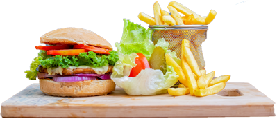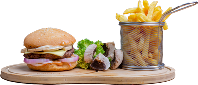 CLASSIC CHICKEN BURGERMinced chicken, seasoned with garlic sauce, fresh raw onions, fresh sliced tomatoes sliced emmental cheese, fresh crisp salad & served with fries. |