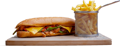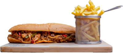 FAJITA CHICKEN CHEESE SUBTender shredded chicken breast seasoned to taste with cumin, paperika. garlic powder. onions powder, tabasco sauce grilled with fresh green pepper, fresh red pepper, mozzarella cheese, sliced cheddar cheese & served with fries. |