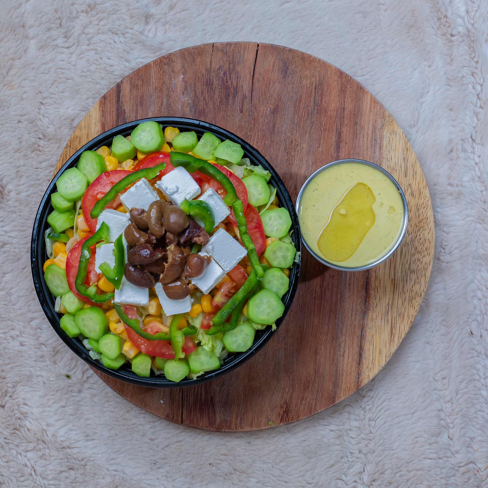 MEDITERRANEAN SALADCrisp lettuce, sweet corn, fresh sliced tomatoes, fresh cucumber, fetta cheese, black olives, sweet green pepper served with venegrate sauce. |
